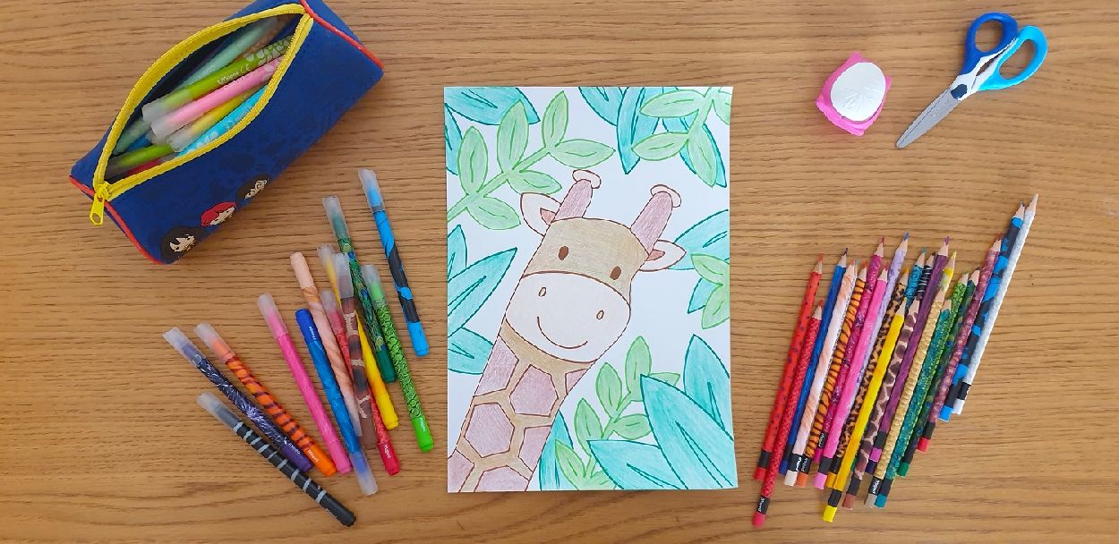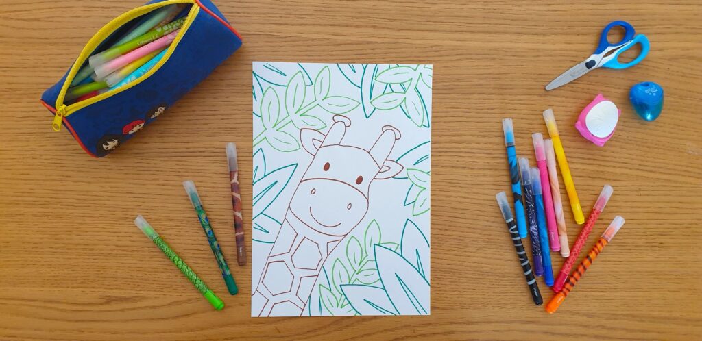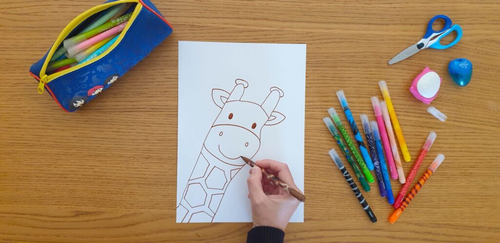 Colour in with your felt tip pens or colouring pencils. Your giraffe is complete!
